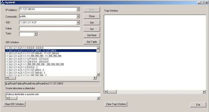 Desigur utilizatorul poate sa afle si informatii mai relevante in misiunea sa de administrare a retelei (de exemplu). Se poate intampla ca pachetele sa nu poata fi trimise catre o anumita retea. In acest caz, administratorul de retea ar putea sa inspecteze tabela de rutare a respectivului device. Aceste informatii sunt continute in obiectul vector ipRouteTable cu OID-ul: .1.3.6.1.2.1.4.21. Astfel, administratorul introduce OID-ul si verifica daca respectiva retea se afla in tabela de rutare. Dupa cum am explicat mai devreme, intregul tabel nu poate fi returnat printr-o singura operatie get. Pentru aceste tipuri de obiecte se foloseste butonul Get Table, care returneaza pe rand fiecare obiect indexat din tabel. Daca se doreste valoarea si tipul unui singur obiect din tabel, un dublu click pe obiectul dorit va afisa toate aceste informatii.