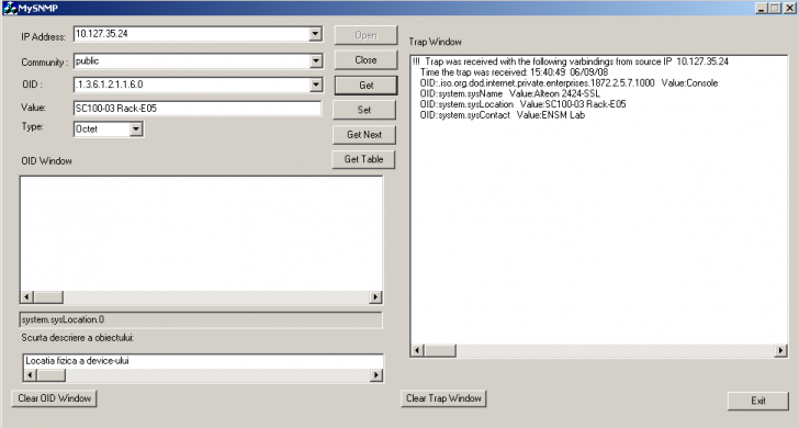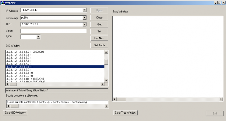 b. Dublu click pe unul din obiectele indexate, caz in care casutele OID, Value si Type vor fi populate cu informatiile corespunzatoare acelui obiect.