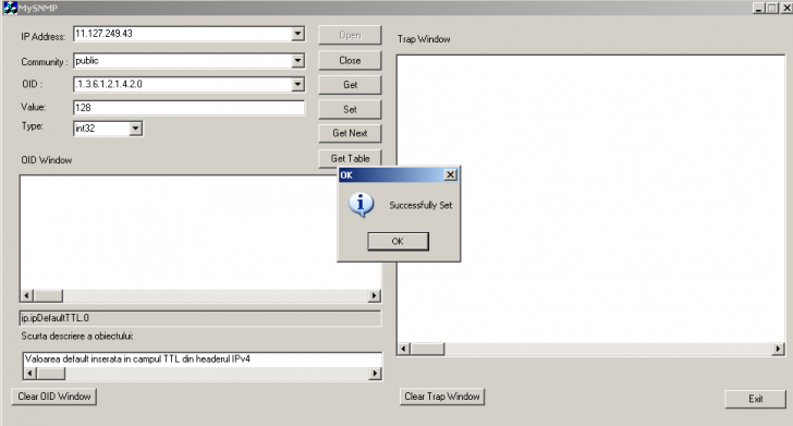 Setarea parametrilor prin SNMP: Se citeste IP-ul, comunitatea si OID-ul. Se verifica daca sirul de caractere introdus are drepturi READ-WRITE. In caz negativ, este afisata o eroare. Se verifica daca OID-ul este suportat de dispozitiv. In caz negativ, este afisata o eroare. Se seteaza parametrul si un mesaj de operatie reusita este afisat.