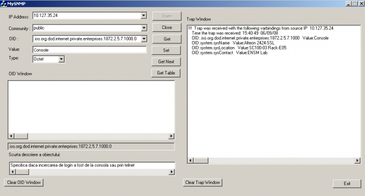Trap-ul primit mai sus se numeste altSwLoginFailure si are scopul de a notifica utilizatorul ca cineva a introdus un set de user/parola incorect. Este un trap specific switch-urilor Alteon si face parte din MIB-ul Cheetah-Trap-Mib. Acest trap are patru variabile de legatura care sunt afisate sub forma de OID/valoare. Insa pentru utilizator aceasta insiruire de cifre nu clarifica situatia chiar deloc. De aceea, in cazul in care utilizatorul ar dori sa afle ce reprezinta respectivul obiect, tot ce trebuie sa faca este sa introduca OID-ul afisat in MIB Browser, impreuna cu IP-ul de la care s-a primit notificarea. In partea de jos a ecranului va fi afisata o scurta descriere a respectivului obiect. De exemplu, in timp ce sysLocation, sysName sau sysContact au nume destul de sugestive incat sa nu necesite alte lamuriri, obiectul cu OID-ul iso.org.internet.private.enterprises.1872.5.7.1000 nu prezinta acelasi avantaj. Astfel, utilizatorul poate deschide o sesiune de comunicare cu dispozitivul Alteon 2424-SSL cu IP-ul 10.127.35.24, introduce OID-ul de mai sus si o scurta descriere in partea de jos a ecranului este afisata: