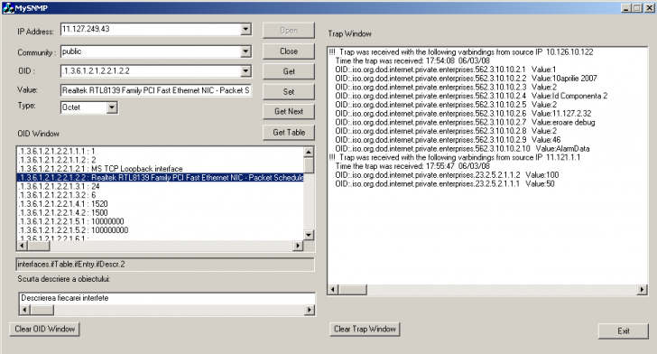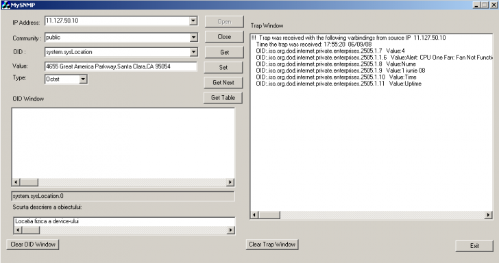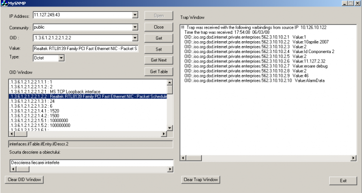 Interceptarea trap-urilor La initializarea aplicatiei, se va porni un fir de executie care asculta trap-uri prin UDP port 162. In momentul in care primeste trap-ul, aplicatia intra in functia TrapCaptureThread si se declanseaza un semnal (trigger). Dupa ce se verifica daca semnalul a fost declansat, in caz pozitiv, se extrage adresa IP, momentul declansarii, iar fiecare variabila a trap-ului este convertita din structura sa de identificator de obiect in sir de caractere. Dupa ce au fost memorate toate acestea intr-o variabila, acea variabila este afisata pe ecran in Trap Window.