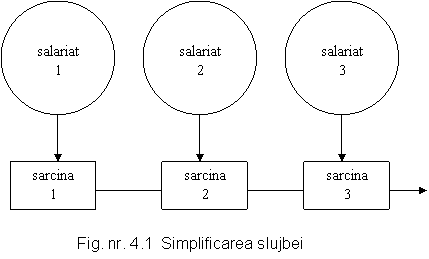 a) Simplificarea slujbei (locului de munca), reprezinta procesul de proiectare a slujbelor prin care ocupantii postului au un numar mic de activitati inguste de executat. Aceasta idee a simplificarii a fost mai departe popularizata de Frederick Taylor prin viziunea sa asupra managementului stiintific, care accentueaza reducerea slujbei la sarcini inguste si instruirea muncitorilor in privinta celei mai bune cai sau modalitati de a le indeplini.