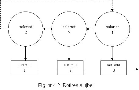 b) Rotirea slujbei, este practica de schimbare sau trecere periodica a salariatilor printr-o multime de slujbe (locuri de munca) dupa o succesiune planificata vezi fig. nr. 2. Abordarea acesta deseori tinteste la reducerea monotoniei sau plictiselii asociata cu simplificarea slujbei prin prevederea unei diversificari a sarcinilor. Rotirea slujbei de asemenea are avantajul policalificarii salariatilor (instruirea lor de a indeplini sau executa sarcini implicate in cateva slujbe) astfel rezultand o flexibilitate maxima in privinta incredintarilor slujbelor. Rotirea slujbei este in general de un mai mare succes sau efect ca un instrument sau mijloc de dezvoltare a salariatului. Din aceasta ultima perspectiva, salariatii sunt rotiti printr-o serie de slujbe mult mai provocatoare astfel ca sa creasca capacitatile lor, sa largeasca flexibilitatea incredintarii slujbei si sa creasca intelegerea lor cu privire la diferitele aspecte ale organizatiei. Problemele potentiale in legatura cu rotirea slujbelor se refera la faptul ca departamentele pot vedea aceasta practica de rotire a indivizilor ca un ajutor temporar (si ca le da lor de facut numai lucruri triviale) si de asemenea ridica problema loialitatii departamentale.