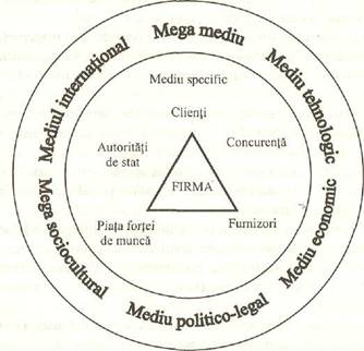 Managementul oricarei firme trebuie sa ia in considerare natura mediului extern in care acesta functioneaza. Mediul poate fi impartit in doua mari segmente: mediul general sau mega-mediul, si mediul specific avand elemente specifice (figura 1).