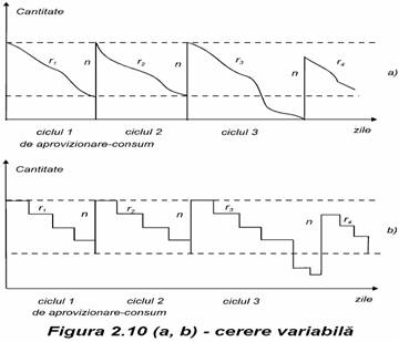 a) Cererea pentru consum (r) - element de baza care conditioneaza nivelul si ritmul eliberarilor de materiale din stocuri si implicit volumul si ritmul aprovizionarilor care asigura reintregirea lor. Aceasta reprezinta motivatia de baza pentru initierea si desfasurarea proceselor de aprovizionare-stocare. Cererea poate fi cunoscuta pe toata perioada de gestiune, caz in care procesul de formare a stocurilor si, respectiv,