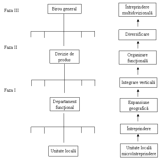 Organizarea structurala a intreprinderii este influentata de strategia acesteia. Conform tezei formulate de Alfred Chandler, structura organizationala "urmeaza" si reflecta strategia de crestere a unei intreprinderi. Acest fenomen se produce deoarece, schimbarile de strategie necesare adaptarii intreprinderii la influenta factorilor de natura tehnologica, economica, demografica, ecologica si legislativa din mediu, creeaza probleme interne de natura administrativa si operationala (ineficienta economica), ce se pot rezolva prin schimbari structurale destinate maximizarii performantelor economice. Intreprinderile parcurg, dupa Chandler, trei faze de dezvoltare structurala: de la unitate, la nivel departamental si apoi la nivel divizional (figura 1).