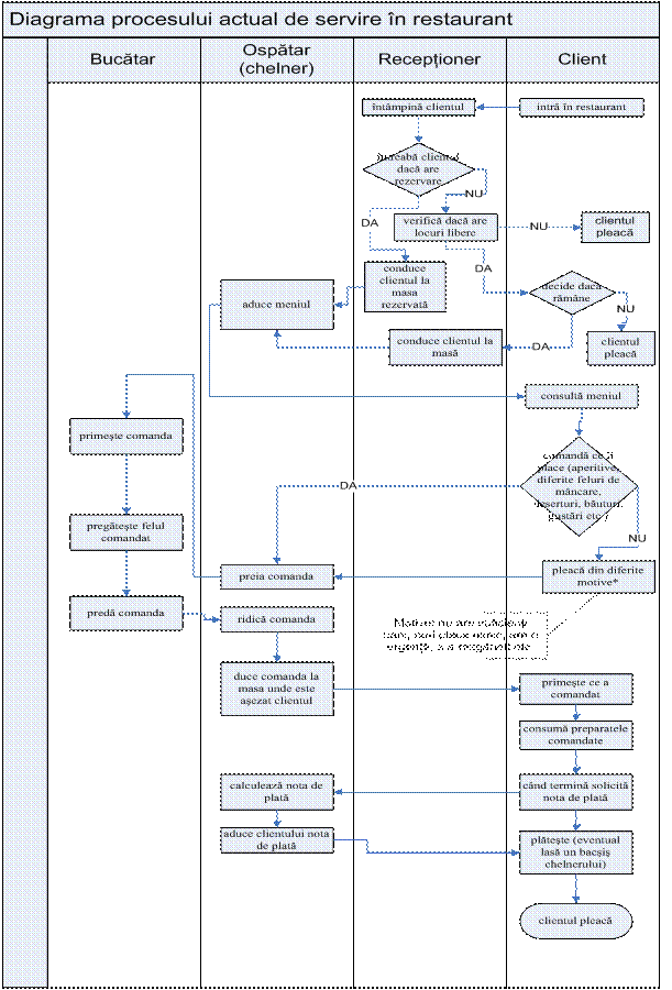 Rezervarile: Orice client potential care doreste sa fie sigur ca va gasi un loc pentru el la acest restaurant suna/vine in prealabil la sediu si face o rezervare. El intra in contact cu receptionerul care, in functie de rezervarile anterioare, de dorintele clientului va face (sau nu) rezervarea. Acum, cu noul program (mult mai eficient) de rezervari va putea chiar face recomandari clientului, daca nu sunt locuri libere la ora dorita de client. Daca acesta accepta reprogramarea rezervarii, receptionerul va consemna in registru. Clientul va reveni la ora, ziua prestabilita.