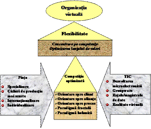 Organizatiile virtuale sunt formatiuni de rutina, reprezentand grupuri sau asocieri de organizatii productive si competitive. Principalul avantaj competitiv il constituie viteza de reactie fata de produsele noi si complexe care apar permanent pe piata. Modul cel mai simplu de trecere la fabricarea de noi produse il constituie selectarea resurselor disponibile la diferite organizatii si integrarea lor prin sintetizare intr-o singura entitate de afaceri electronice - organizatia virtuala. Daca diversele resurse distribuite, umane si fizice, sunt compatibile intre ele (in cazul in care acestea isi pot indeplini functiile respective impreuna), atunci organizatia virtuala se poate comporta ca si cum ar fi o singura organizatie care lucreaza pentru un singur proiect. Atata timp cat exista oportunitati pe piata, organizatia virtuala va continua sa existe, iar cand oportunitatea dispare, organizatia se dizolva si angajatii sai se vor ocupa de alte proiecte.