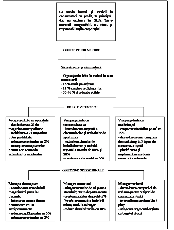 Obiectivele - exprima sintetic viitoarele rezultate dorite de catre organizatie. Acest rezultat este exprimat in termeni concreti, cantitativ si reprezinta o finalitate a tuturor actiunilor si demersurilor membrilor organizatiei, fundamentand ratiunea de a aloca resursele disponibile. In concluzie obiectivul este un rezultat planificat si realizat si nu o activitate. De aceea el trebuie definit foarte clar, respectiv sa fie cuantificabil, utilizandu-se de obicei indicatori economici si cu un termen de realizare.