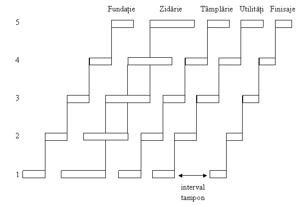 Cine va lucra la o astfel de diagrama va remarca o mica problema de programare, creata de faptul ca nu toate activitatile au aceeasi durata. Angajatii care executa lucrari de mai scurta durata trebuie sa stea sa-i astepte pe ceilalti, ceea ce creeaza perioade fara activitate. Una dintre solutii, asa cum se observa si in fig. III.5 este introducerea de intervale tampon.