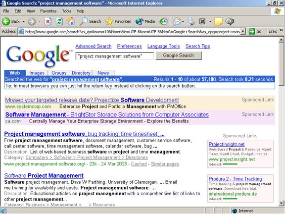 Din nefericire, aceste principii nu sunt intotdeauna intelese si acceptate. Inca se mai pot intalni persoane de conducere, planificatori si manageri de proiect care traseaza diagrame complicate pentru planuri de lucru care se intind pe mai multe luni de zile sau chiar ani, fara nici un rost si cu un numar impresionant de detalii. Asa cum s-a mai spus, programarile trebuie sa fie flexibile, sa permita refacerea calculelor cand se iau in considerare lucrari noi sau cand intervin schimbari. Sistemele manuale de programare nu ofera suficienta flexibilitate decat in cazurile simple si din aceste motive multe firme au elaborat programe specializate de management general si management de proiect care implica utilizarea computerului si a tehnologiei informatiei. Este suficient sa navigam in Internet si sa cautam cuvintele cheie 'project management software' ca sa putem vedea bogata oferta de pachete software destinata acestui domeniu - aproximativ 57.100 de site-uri! (fig.III.6).