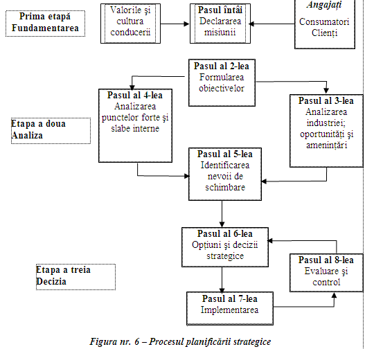 Planificarea strategica reprezinta un proces rational care poate (si ar trebui) sa fie utilizat si modificat de managerii din toate tipurile de organizatii. Pe fondul existentei unor discrepante intre modelele create de diferiti practicieni sau teoreticieni, figura urmatoare ofera o imagine a componentelor procesului planificarii strategice, care poate fi impartit in trei etape generale si opt pasi.