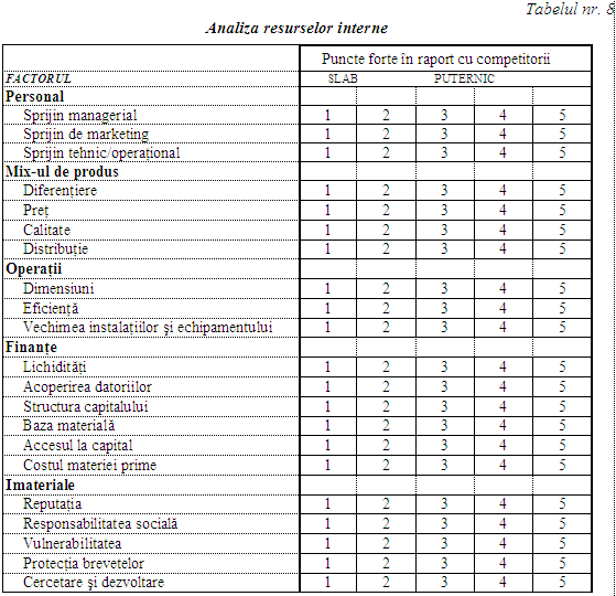 4. Compararea propriilor puncte forte si slabe cu cele ale competitorilor in vederea identificarii resurselor si abilitatilor care ar putea ajuta la obtinerea unui avantaj pe piata.