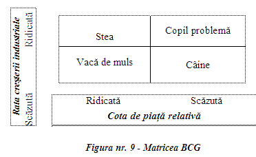 Modelele matriceale. Primul model matriceal a fost propus de Boston Consulting Group (B. D. Henderson). Modelul examina pozitia produsului pe baza potentialului intern al produsului si pe baza potentialului pe piata externa. Potentialul intern a fost definit ca forta competitionala si a fost masurat prin cota de piata; potentialul pe piata externa este similar cu modelul ciclului de viata al produsului prin faptul ca se refera la cresterea cererii pentru produs. Prin folosirea unei clasificari de la valoarea cea mai inalta pana la cea mai joasa a acestor dimensiuni a rezultat matricea BCG.