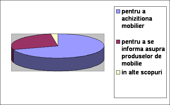 Rezultatele obtinute au confirmat ipoteza avansata, 70% dintre intervievati vizitand magazinul de desfacere a mobilei in scopul informarii asupra produselor de mobilier si numai 27,5% dintre ei in vederea achizitionarii de piese de mobilier. De asemenea un numar foarte redus dintre subiectii intervievati respectiv 10 (2,5 %) se aflau in magazin in alte scopuri .