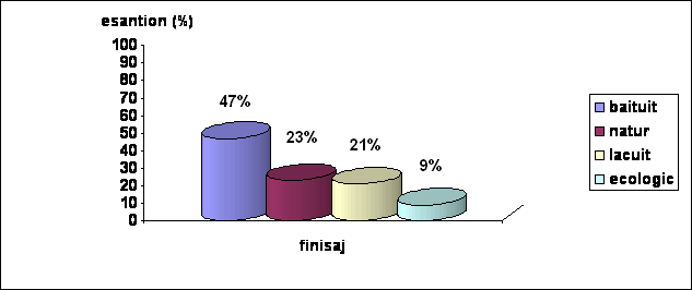 Din cei 400 de intervievati, reprezentiand 100% : 188 (47%) sunt de parere ca realizarea unui finisaj baituit ar determina imbunatatirea ofertei de mobilier a societatii ; 92 (23%) propun finisajul natur ; 84 (21%) propun finisajul lacuit ; iar 36 (9%) se exprima pentru realizarea unui finisaj ecologic. Repartitia propunerilor se prezinta in figura urmatoare :