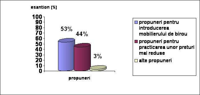 Din cei 400 de intervievati , reprezentand 100% : 212 (53%) propun pentru imbunatatirea ofertei de mobilier a societatii, introducerea de mobilier de birou , 176 (44%) propun practicarea unor preturi mai reduse , iar 12 (13%) au alte propuneri de imbunatatire ( facilitati la achzitionare : sistem de rate mai avantajos , transportul la domiciliu gratuit , folosirea la dulapurile din componenta dormitoarelor a mai multor oglinzi ). Propunerile exprimate sunt prezentate in figura 10.
