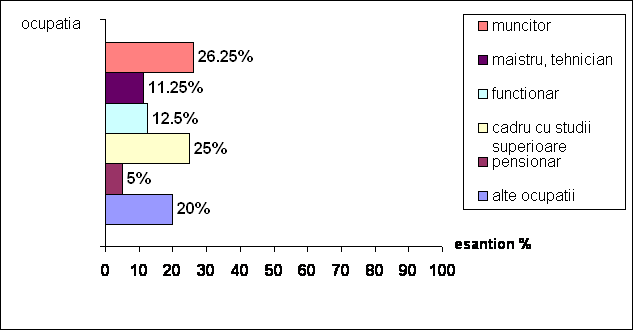 Ponderile sunt apropiate, cea mai importanta pondere fiind detinuta de persoanele care s-au incadrat in categoria muncitori, la o diferenta nesemnificativa situandu-se persoanele din categoria cadre cu studii superioare . De asemenea si persoanele care s-au incadrat in categoria functionari si cei cu alte ocupatii detin ponderi insemnate in cadrul esantionului . In aceasta situatie rezultatele obtinute confirma ipoteza avansata .