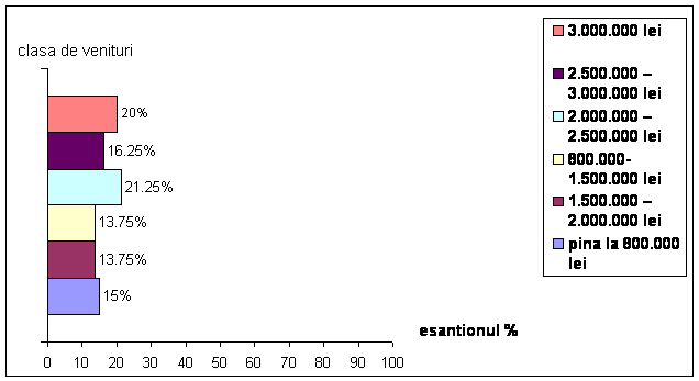 In acest caz cel mai important segment de persoane il reprezinta cel al carui venit lunar se situeaza intre 2.000.000.- 2.500.000 lei, la o diferenta nesemnificativa se afla segmentul de persoane cu venitul lunar peste 000.000 lei .O pondere insemnata o detin si persoanele intervievate al caror venit lunar se incadreaza intre 2.500.000 - 000.000 lei. Se observa egalitatea dintre ponderile detinute de persoanele cu venituri lunare intre 800.000-1.500.000 lei si respectiv cele cu venituri lunare intre 1.500.000 - 2000.000 lei, o pondere mai ridicata decat acestea o au persoanele cu venituri sub 800.000 lei . Rezultatele obtinute nu confirma ipoteza avansata .