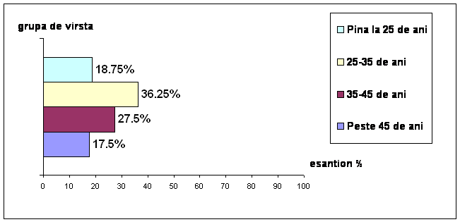 Din cei 400 de intervievati , reprezentand 100% : 75 (18,75%) au varsta pana la 25 de ani ; 145 (36,25%) se incadreaza in grupa de varsta intre 25-35 ani; 110 (27,5%) se incadreaza in grupa de varsta intre 35- 45 ani; iar 70 (17,5%) se situeaza in grupa de varsta de peste 45 de ani.