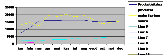In exemplul de mai jos vom arata corelatiile intre modificarea nivelului productivitatii si productia realizata, consumul de factori (materii prime, salarii).