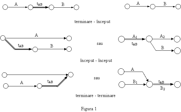 de tip 'terminare - inceput'. Acest tip este cel mai frecvent intalnit si spunem ca o activitate A precede activitatea B printr-o interdependenta de tip 'terminare - inceput' daca activitatea B nu poate incepe decat dupa un interval de timp tAB de la terminarea activitatii A. Acest interval poate fi egal si cu zero, caz in care spunem ca activitatea A precede direct activitatea B;