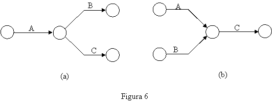 Daca doua sau mai multe activitati au aceeasi activitate direct precedenta, de exemplu A precede B si A precede C, reprezentarea in graful-retea va avea forma din figura 5 (a). Arcele B si C simbolizeaza doua activitati care nu pot incepe decat dupa ce s-a terminat activitatea A. Activitatile B si C pot fi executate simultan. De asemenea executia unei activitati poate depinde de terminarea mai multor activitati direct precedente, de exemplu A precede C si B precede C ca in figura 5 (b). In aceasta situatie, activitatea C nu poate incepe, logic, decat dupa ce s-au terminat activitatile A si B.