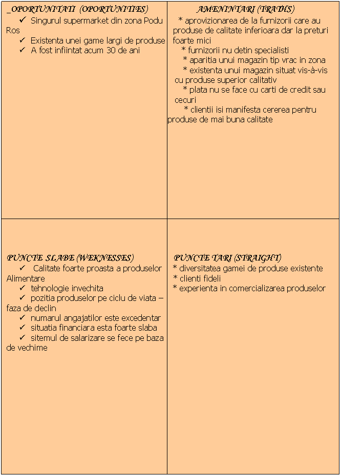 Concurenta este acerba deoarece produsele de proasta calitate (preparatele din carne si carne, lactate ,conserve, mancare pentru bebelusi) sunt cautate doar de clientii cu venituri foarte mici, in timp ce produsele superioare calitativ sunt preferate de toate categoriile de clienti, dar vanzarile nu se ridica la nivelul asteptarilor managerilor deoarece supermarketul este cotat ca fiind unul slab.Concurenta o reprezinta vracul si un magazin din apropiere.
