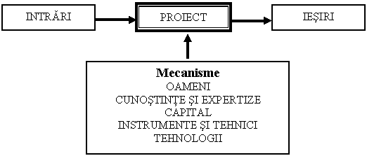 O alta viziune asupra proiectului conduce la urmatoarea definitie: proiectul poate fi vazut drept conversia unei necesitati in satisfacerea acelei necesitati in cadrul unor anumite constrangeri, utilizand anumite mecanisme, evidentiate in figura de mai jos.