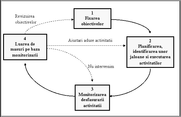 o Procesul buclei de control-planificare (sau replanificare), monitorizare, elaborare de decizii, etc-se desfasoara continuu, fie prin revizuirea obiectivelor ori a activitatilor, fie pe baza celor fixate din start. Un proiect poate sa ajunga la final dar, de multe ori, inca inainte de incheierea lui, poate sa declanseze o problema noua care sa impuna reluarea etapelor