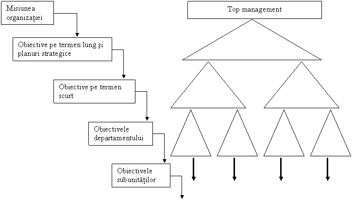 Obiectivele organizatiei ofera directie si scop si trebuie exprimate in termenii rezultatelor dorite Stabilirea obiectivelor incepe la nivelul conducerii de varf cu enuntarea unei misiuni, care defineste afacerea prezenta si viitoare.Obiectivele pe termen lung(cele strategice) sunt formulate pe baza acestei; urmeaza cele pe termen scurt care sunt, in general, cantitative. Pentru fiecare departament sau echipa de lucru sunt stabilite obiective specifice.Aceasta maniera de a construi obiectivele este denumita "in cascada".Aceasta permite implicarea in activitatea de planificare a tuturor nivelurilor de conducere si un schimb de informatii in dublu sens.