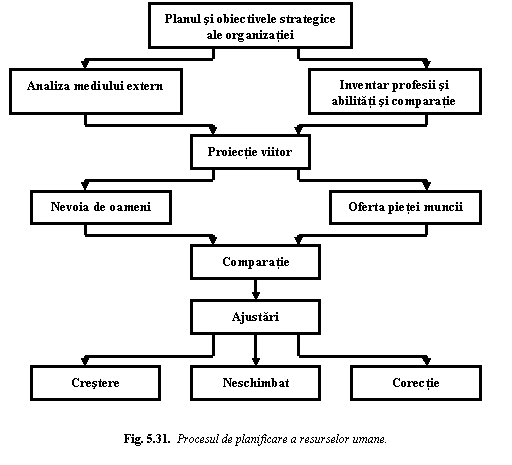 Procesul de Planificare a Resurselor Umane este prezentat schematic in figura 4.3 si cuprinde sase faze: (1) Analiza (scanarea) mediului extern organizatiei pentru identificarea schimbarilor ce pot afecta oferta de forta de munca; (2) Analiza inventarului de profesii si potential si compararea nevoilor organizatiei cu oferta disponibila pe piata muncii; (3) Proiectia cererii si ofertei de resurse umane; (4) Stabilirea obiectivelor; (5) Proiectarea si implementarea planului de actiune: efectuarea ajustarilor la nivelul fortei de munca existente; (6) Evaluarea rezultatelor.