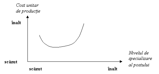 Daca initial modelul taylor-ist, bazat pe diviziunea muncii, a impus posturile specializate ca solutie de crestere a performantelor consumului de munca, ulterior practica a aratat ca de la un anumit punct superspecializarea nu mai conduce la cresterea performantelor ci necesita anumite cheltuieli care fac sa creasca costurile unitar de productie. Acest lucru se prezinta grafic in figura 1.5.