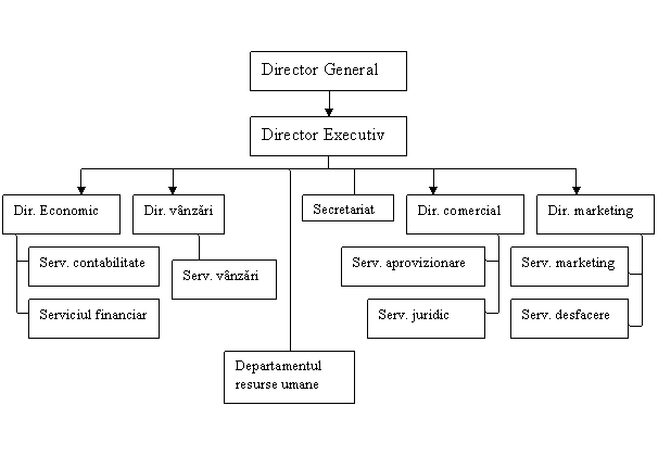 Din prezentarea organigramei se observa ca in cadrul firmei s-a constituit distinct departamentul de marketing, care este subordonat directorului executiv, iar in cadrul sau exista doua servicii: desfacere si marketing.