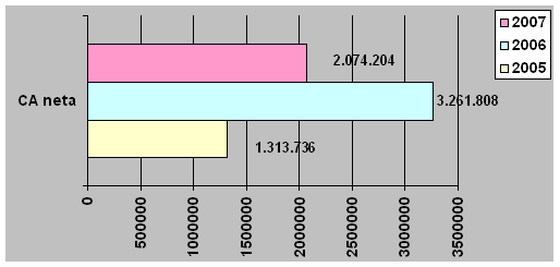 Se poate observa ca, daca in anul 2005 cifra de afaceri avea o valoare de 1.30736 lei, in anul 2006 aproximativ se dubleaza, ajungand la 261.808 lei, pentru a scadea din nou in 2007, atingand valoarea de 2.074.204 lei.