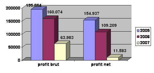 Pentru perioada reliefata in grafic se remarca o scadere, de la an la an, atat a profitului brut, cat si a celui net.
