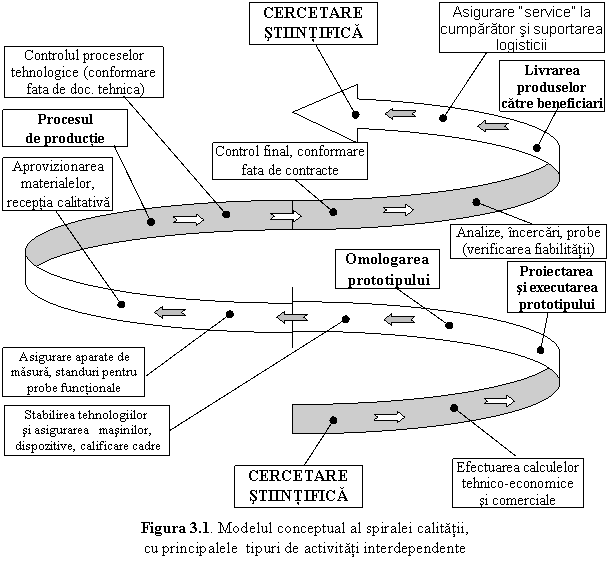 Spirala calitatii reprezinta un model conceptual al activitatilor interdependente care isi exercita influenta lor asupra calitatii unui produs sau serviciu in intreaga desfasurare a fazelor, incepand cu identificarea nevoilor pana la evaluarea satisfacerii lor (fig. 3.1).