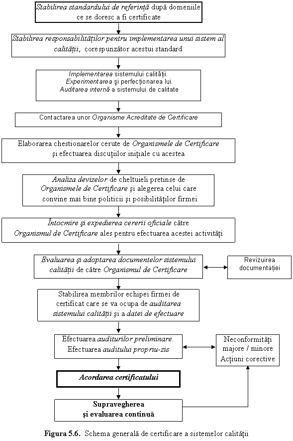 Procesul de certificare trebuie demarat prin abordarea problemei de catre conducerea firmei. Calitatea trebuie sa fie o problema a conducerii firmei nu a unor servicii din cadrul acesteia. Schema generala a unui proces de certificare este prezentata in figura 5.5.