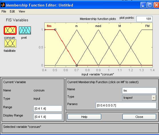 Pentru variabila de intrare consumul universul de discurs este cuprins in intervalul [0.4 1.4] (exprimat in kwh) si avand functiile de apartenenta :