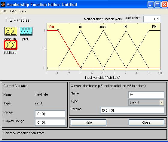 Pentru variabila de intrare fiabilitatea universul de discurs este cuprins in intervalul [0 10] si avand functiile de apartenenta :
