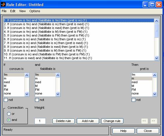 unde x si y variabile de intrare; z este variabila de iesire; mic - este o functie de apartenenta (subset fuzzy) definit pentru x; mare - este o functie de apartenenta definita pentru y, iar mediu - este o functie de apartenenta definita pentru z.
