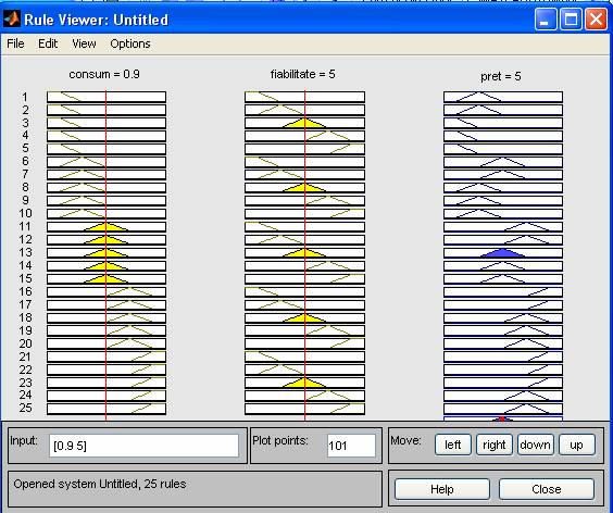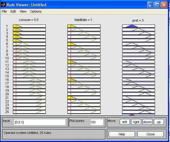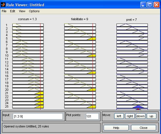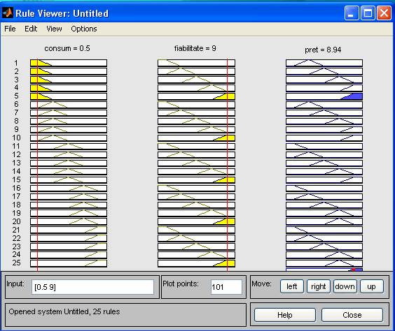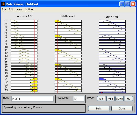 Se observa ca in exemplul 1 la un consum de 0.5 kwh si o fiabilitate notata cu 1(la o scara de la 0 la 10),pretul aspiratorului este de 3 (mil ROL),iar la aceeasi fiabilitate de 1 si la un consum mai mare -1.3kwh ,conduc la scaderea pretului aspiratorului-1.06.