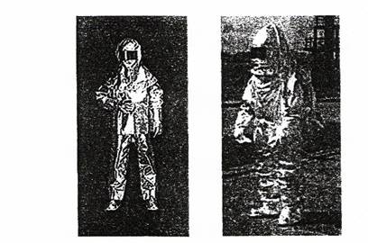 Pentru intervale scurte de timp poate rezista la temperaturi de 400-600C.Se compune din: gluga(capison) cu vizor, bluza, manusi, pantaloon, cizme.Costimul de protectie pentru patrundere in foc (foto 5) este confectionat dintr-o singura piesa,din materiale speciale, captusit la interior cu lana si Kevlar si permite trecerea prin foc. In spate, in interiorul costumului se afla amplasat aparatul de respirat.