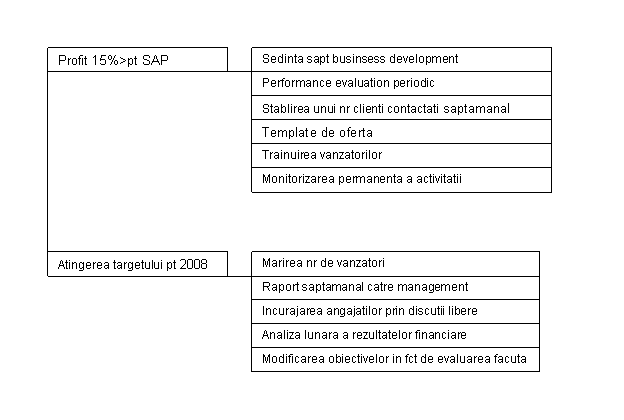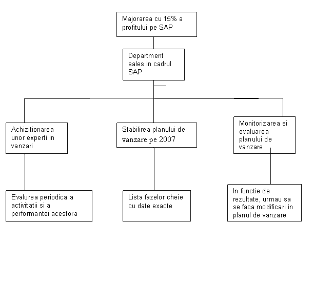 Ceea ce a generat un obiectiv SMART- daca se dorea crestera profitului pentru un departament care-si marea capitalul uman cat si resursele, trebuia sa se investeasca intr-un segment de sales independent de cel deja existent, aceasta ar fi generat un nou centru de profit.