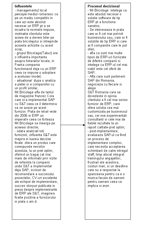 Comportamentul decizional al clientului a fost influentat de o serie de factori: situationali, de grup- decizia de a implementa un ERP venea de la compania-mama, individuali si mai ales de catre furnizorul S&T care a mizat pe calitatea produslui oferit prin prisma experientei in implementari, a consultantilor seniori profesionsti si a referintelor foarte bune de piata.