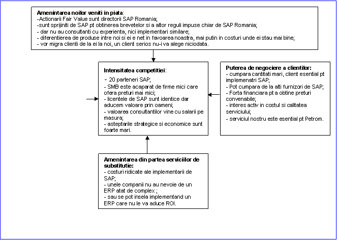 - numar mare de concurenti- piata in crestere, SAP-ul devine un serviciu necesar unei companii care vrea sa aiba vizibilitate legislativa conform cu normele europene deci creste si numarul celor care pot oferi acest serviciu, exista aproximativ 20 de parteneri SAP din care se departajeaza in jur de 6 companii printre care si noi care sunt Gold Partner SAP, asta insemnand ca dispun de niste facilitati si avantaje fata de ceilalti; |