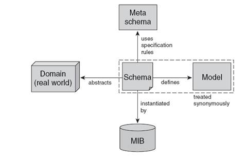 Definitia MIB trebuie specificata folosind un anumit limbaj, care se mai numeste si metaschema. Termenul metaschema inseamna schema unei scheme, o definitie a cum se scrie si se interpreteaza definitiile modelului. In figura de mai jos sunt prezentate relatiile dintre schema, metaschema, model si domeniu.