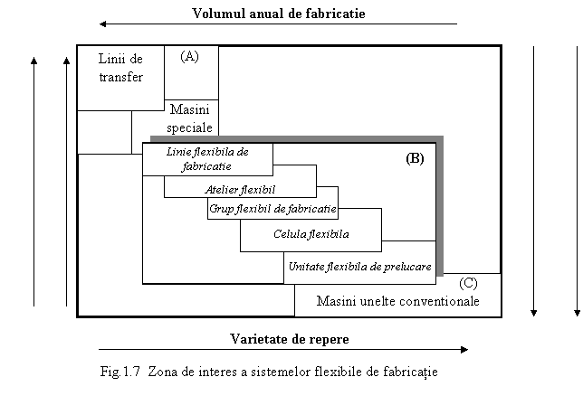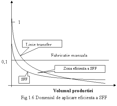 Dupa cum se observa in figura 1.7 Sistemele flexibile de fabricatie sunt situate intre sistemele conventionale automate destinate productiei de serie mare si masa si sistemele conventionale neautomatizate, sau foarte putin automatizate, destinate productiei de serie mica. Din punct de vedere al componentelor si modului lor de grupare se pot identifica cinci tipuri de SFF care difera prin complexitate si arie de cuprindere, neexistand totusi o delimitare foarte precisa intre ele, dupa cum urmeaza [5,7,10,11]: