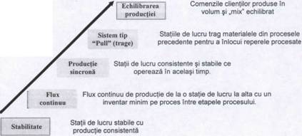 Etapa a doua pleaca de la premisa realizarii unui flux continuu de productie cu transfer facil de la un post de lucru la altul, pe trasee bine stabilite, avand la baza un inventar minim de proces pe linia tehnologica. In a treia etapa se urmareste obtinerea unei sincronizari a proceselor de productie plecand de la realizarile obtinute in primele doua etape cu o focalizare cat mai pronuntata pe cerintele si nevoile clientilor, pe termenele de executie si pe volumul de productie. Se urmareste, de asemenea, asigurarea unei coeziuni de echipa intre participantii la procesul de productie cu ajutorul unor intalniri regulate care urmaresc evidentierea obiectivelor si a problemelor aparute pe flux. Etapa a patra are in vedere implementarea sistemului "pull (trage)', una din verigile esentiale ale conceptului "Lean manufacturing', cu implicatii majore atat asupra procesului de productie, cat si asupra personalului implicat in proces, pentru ca va impune schimbari majore asupra mentalitatii personalului si asupra culturii organizatorice.