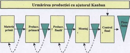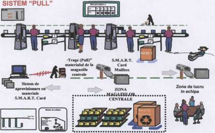 Modul in care este adus - 'tras' materialul pe linie se desfasoara conform figurii 6, care este descrisa in randurile urmatoare. Cand este consumat materialul, adica stocul a scazut sub limita minima stabilita (si doar atunci) furnizorului i se cere sa aduca din nou material. Acest lucru se realizeaza cu ajutorul unui Kanban (Card Kaban), care este transportat cu fiecare lot de repere. Cardul este utilizat si pentru a face o noua comanda.